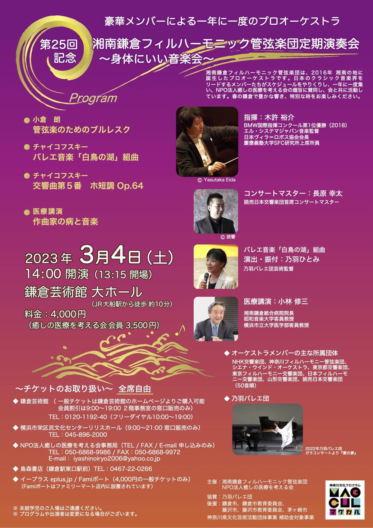 「第25回 湘南鎌倉フィルハーモニック管弦楽団定期演奏会 ~身体にいい音楽会」は 鎌倉芸術館大ホールにて 3月4日(土)開催! 誌主催のNPO法人癒しの医療を考える会理事長で 湘南鎌倉総合病院院長の小林修三さんをゲストにお迎えしました。