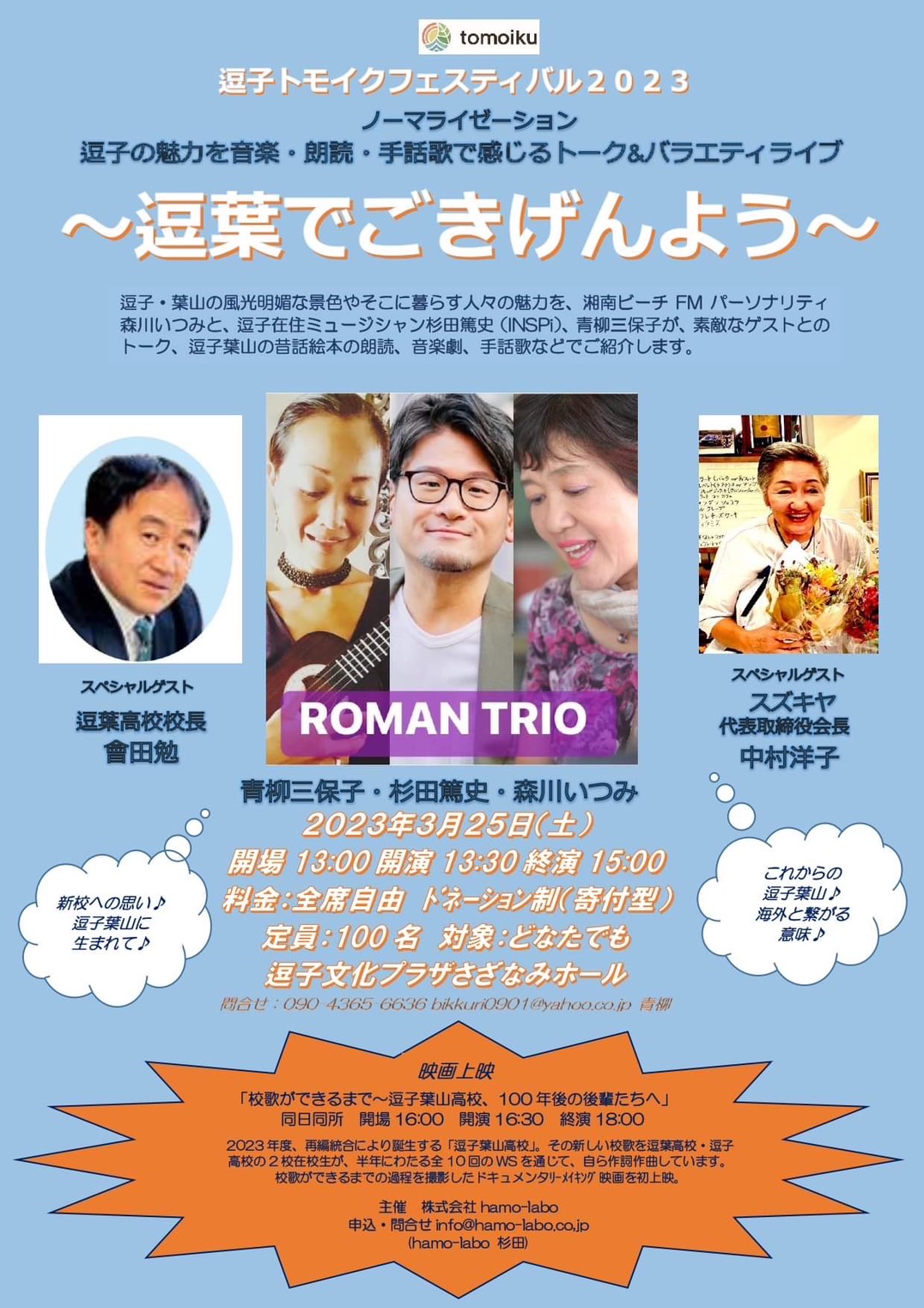 来月3月25日(土)に逗子文化プラザさざなみホールで「トモイクフェスティバル」に参加いたします。その打ち合わせが週末行われました。