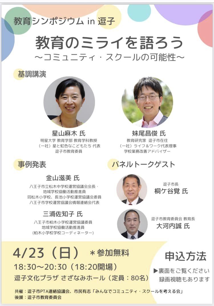 今月23日に教育のミライを語ろう~コミュニティ・スクールの可能性~という教育シンポジウムを、逗子市PTA連絡協議会との共催で開催します。 逗子市にこれから導入されるコミュニティ・スクールついて、専門家の方の話や、先行的に取り組んでいる事例をお聞きして、逗子らしいコミュニティ・スクール実現に向けて、学校・保護者・地域住民が共に学び、考えるシンポジウムです。