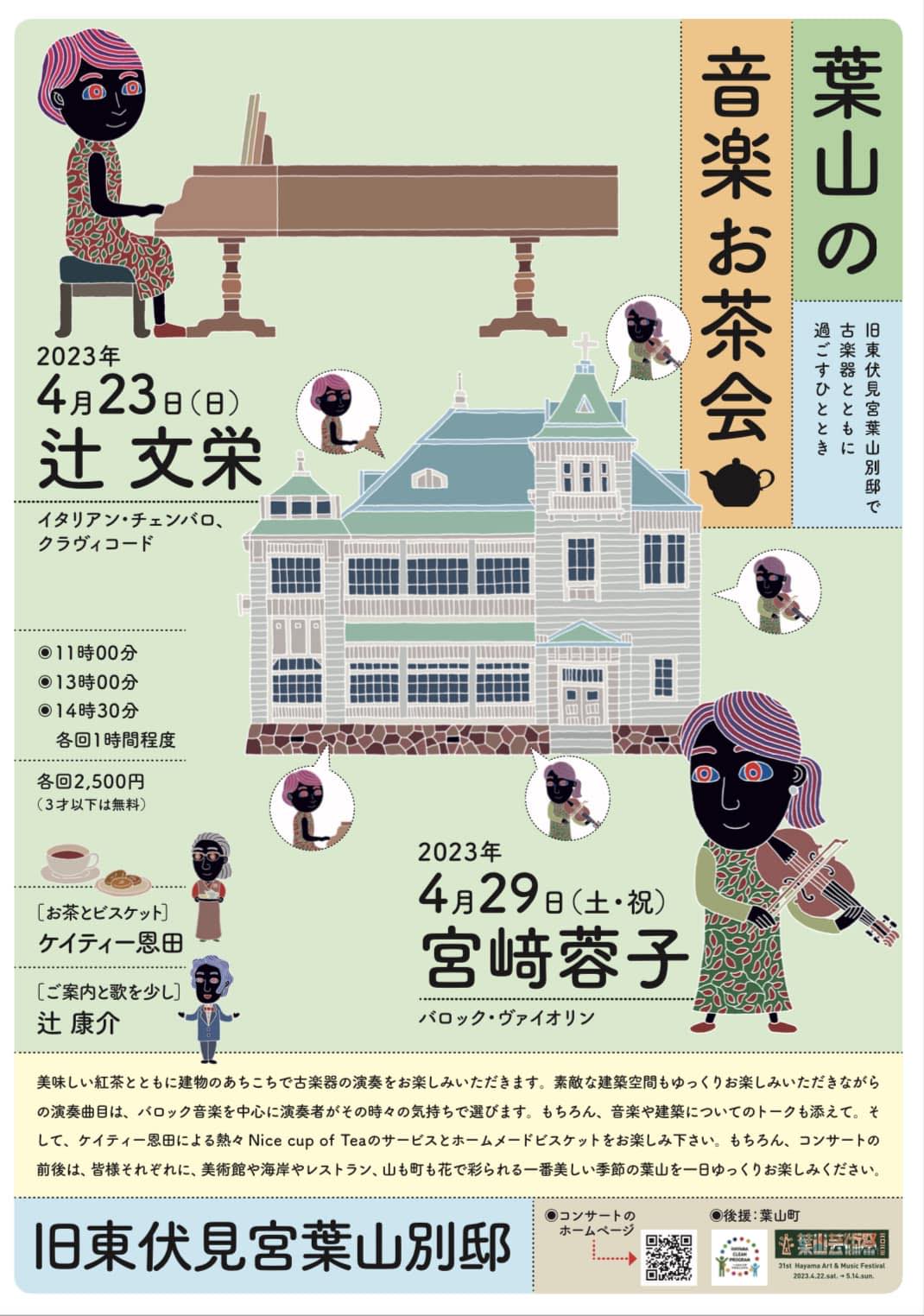 葉山の音楽お茶会 旧東伏見宮葉山別邸で古楽器とともに過ごすひととき 美味しい紅茶とともに建物のあちこちで古楽器の演奏をお楽しみいただきます。素敵な建築空間もゆっくりお楽しみいただきながらの演奏曲目は、バロック音楽を中心に演奏者がその時々の気持ちで選びます。もちろん、音楽や建築についてのトークも添えて。そして、ケイティー恩田さんによる熱々Nice cup of Teaのサービスとホームメードビスケットをお楽しみ下さい。コンサートの前後は、美術館や海岸やレストラン、山も町も花で彩られる一番美しい季節の葉山と葉山芸術祭を一日ゆっくりお楽しみください。