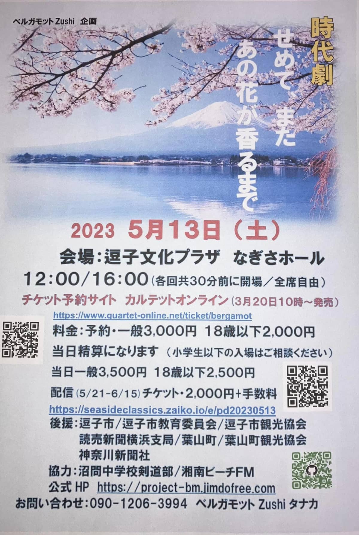 「時代劇 せめて、また あの花が香るまで」 5月13日(土)逗子文化プラザ なぎさホールで開催されます。 主催のベルガモット Zushi の 田中美奈子さんをスタジオに お迎えしました。