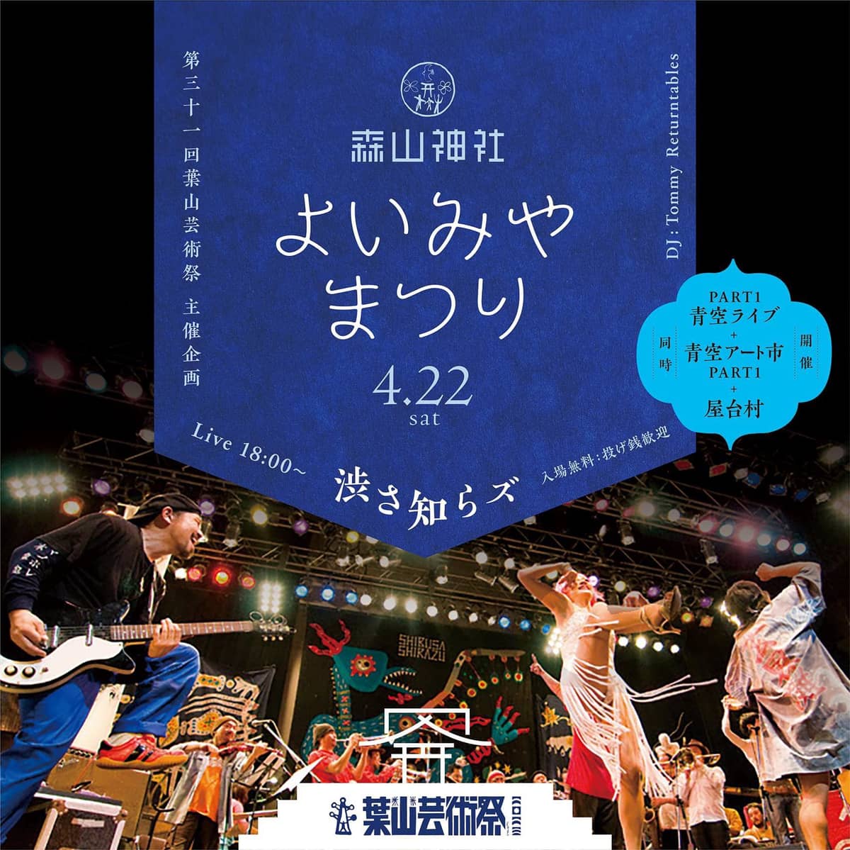 その中でも22日(土)にはオープニングイベントとして、森山神社で よいみやまつり そして青空アート市PART-1を開催します。クラフトマーケットはもちろん美味しいフード&ドリンク、そして今年は、昼から若手音楽家達のライブやTommy ReturntablesのDJ、そして夜は「渋さ知らズ」のライブがあります!