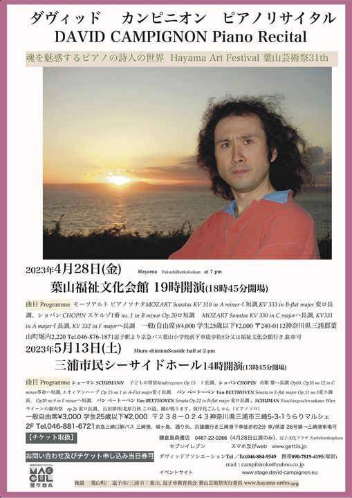 葉山芸術祭企画「ダヴィッドカンピニオン ピアノリサイタル」は 葉山町福祉文化会館で4月28日(金)、三浦市民シーサイドホールで5月13日(土)、 塚原洋子絵画展&Campignon音楽 は 葉山の木の下会館で5月3日~6日 開催。