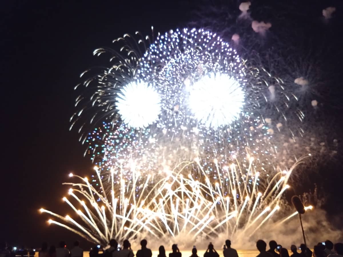 グランドフィナーレは30分間の「コロワイドドリーム花火in逗子海岸」、まさに花火エンターテイメントショーで音楽とともに楽しめました。 私の隣でディレクションしてくれたのは4年前と同じく日本橋丸玉屋の島野さん。いらした方の大歓声!笑顔がたくさん見られました。