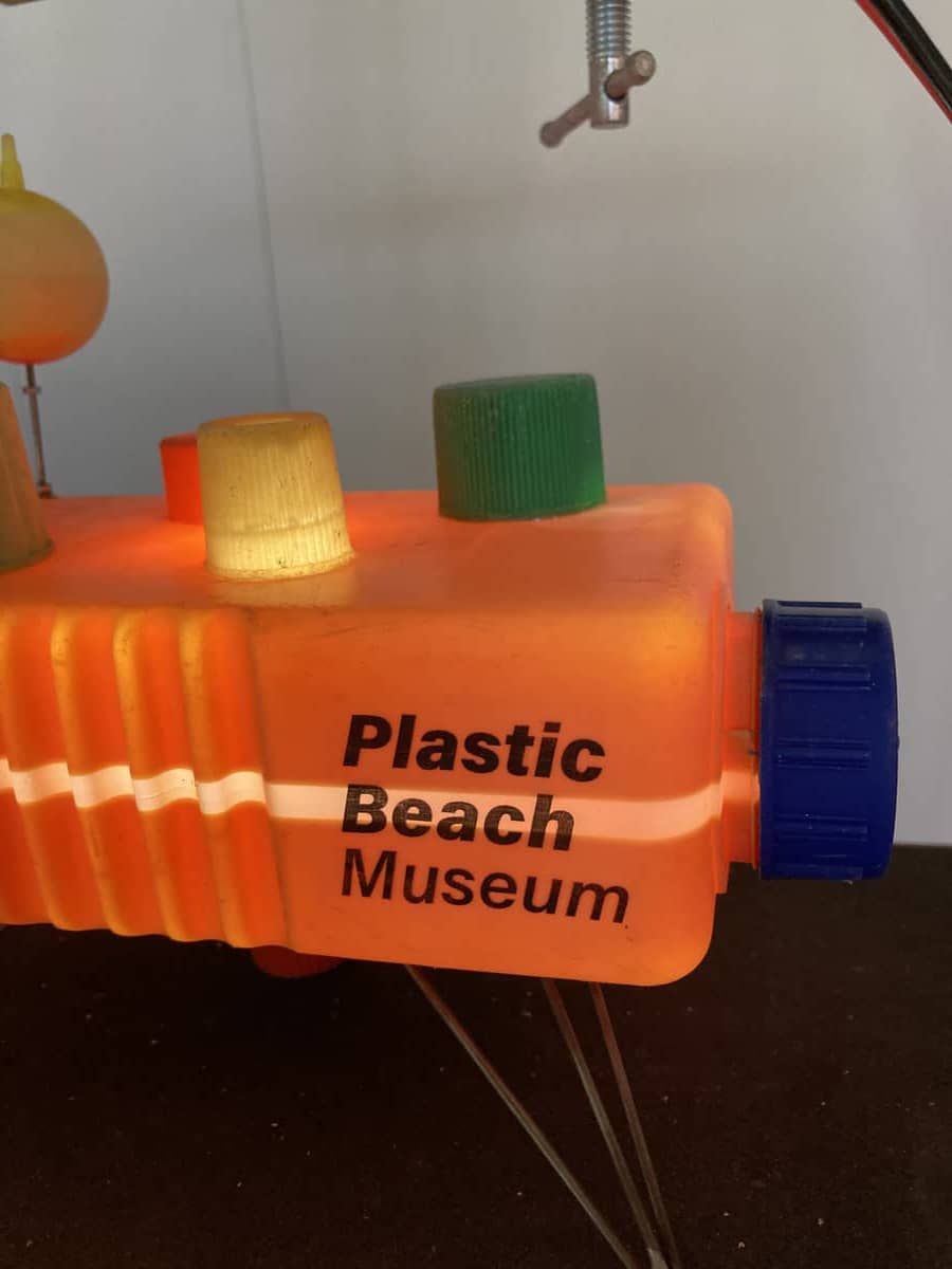 今回の作品展でも海洋プラスチックを材料にして作られたランプや スピーカーが並びました。