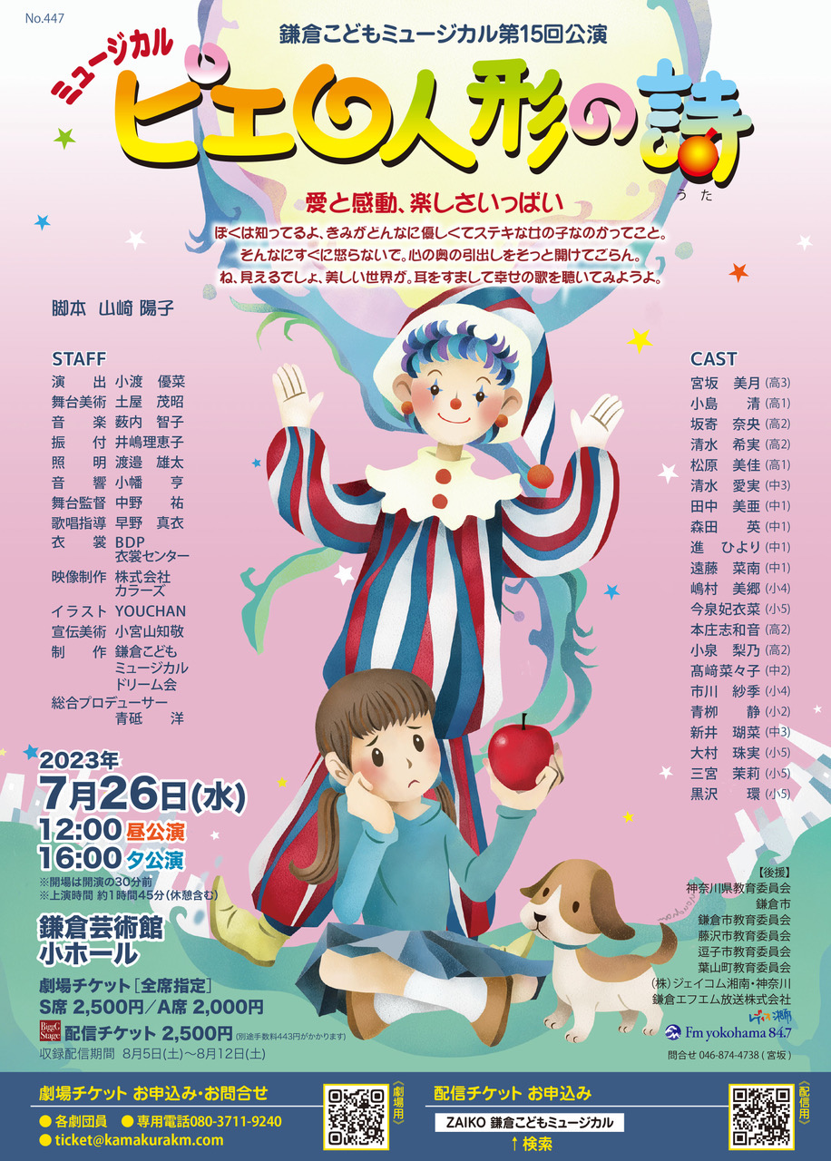第15回公演「ピエロ人形の詩」は 7月26日(水)鎌倉芸術館小ホールにて。12時昼公演 16時夜公演。配信チケットもありますよ!