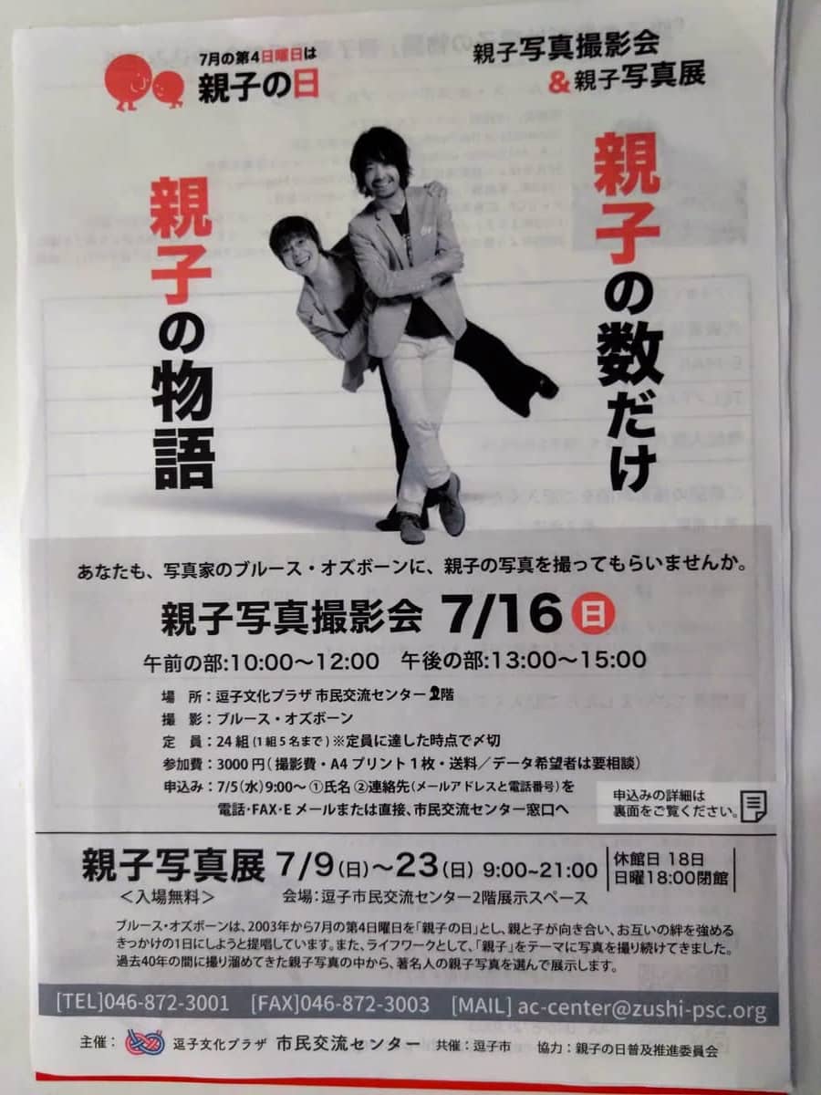 あなたも、写真家 ブルース・オズボーンに親子の写真を撮ってもらいませんか? 親子写真撮影会は逗子市民交流センターで7月16日(日)に開催されます。ブルースさんのような素晴らしいプロの写真家に撮影していただける素晴らしい機会。ちょっと緊張する? かもしれませんが・・いえいえざっくばらんに 好きな服装でたとえば趣味にちなんだ 装いなどお気軽に楽しくご参加くださいとのことですよ。