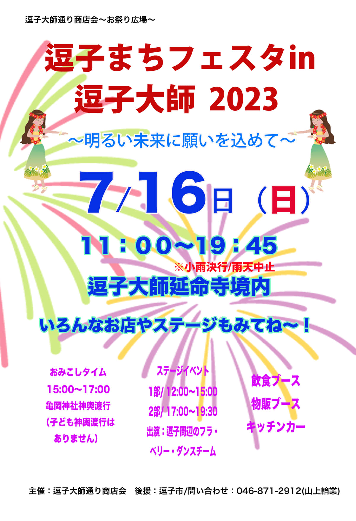 毎年 亀岡八幡宮の例大祭とともに周辺の商店街でもお祭り広場があり、逗子大師通り商店会では 逗子大師延命寺境内で華やかにイベントがおこなわれています。コロナ禍で中止で残念でしたが やっと今年開催、4年ぶり!イベント開催にむけて 商店会のみなさんも張り切っているそうですよ。16日(日)11時スタートですね。出店のお店は11、2店舗。ステージも楽しみ♪