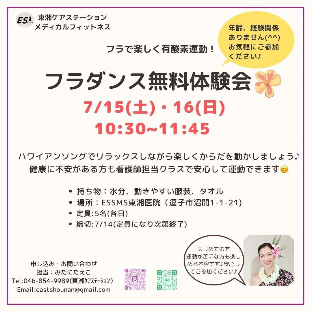 フラで楽しく有酸素運動! フラダンス無料体験会について 東湘ケアステーション代表で東湘医院看護師・フラインストラクターの 三谷妙子さんにお電話インタビュー。