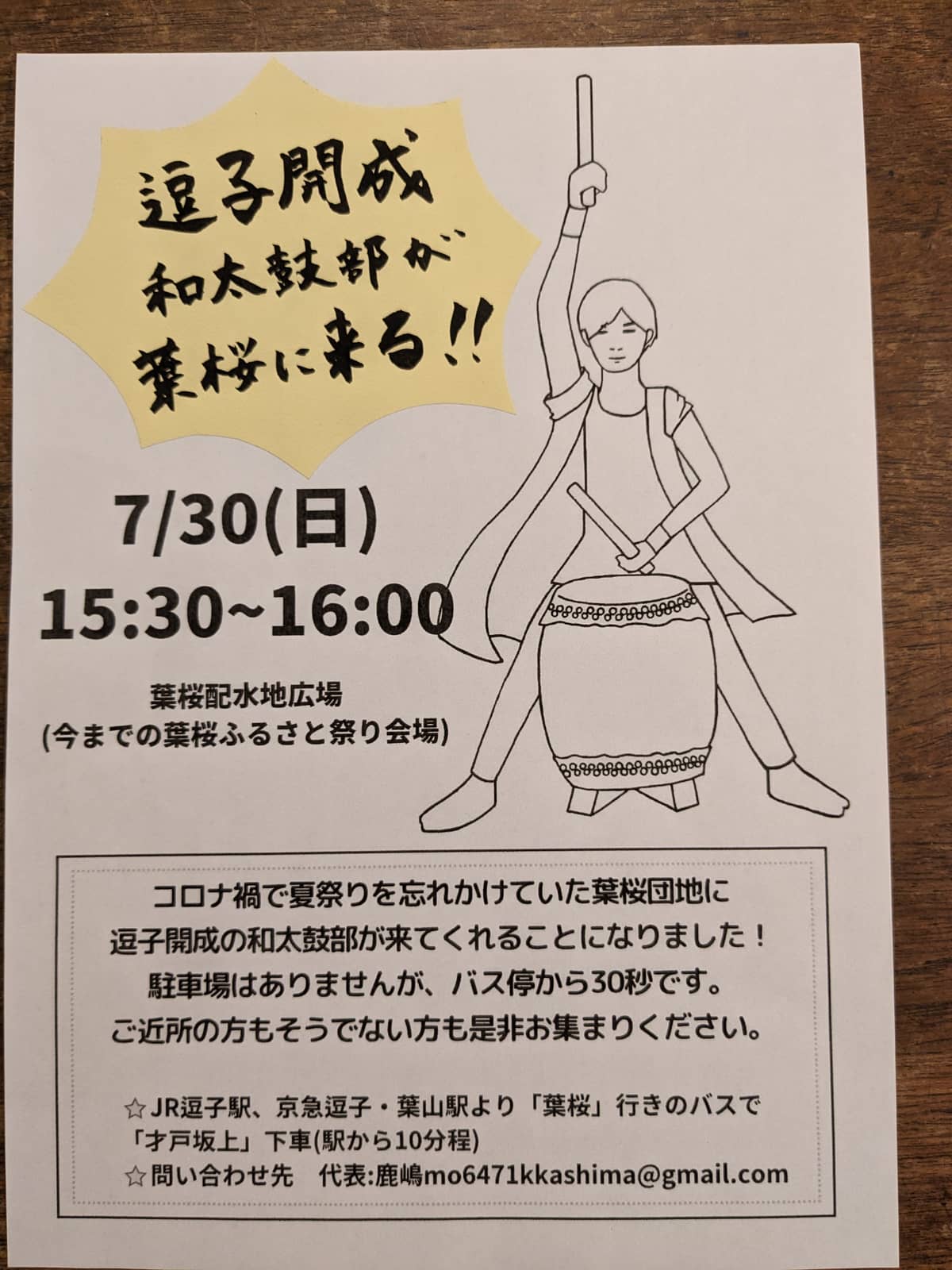 今回どうして葉桜配水池広場(今までの葉桜ふるさと祭り会場)で逗子開成を呼ぼうと思ったのかというと・・お神輿が練り歩くと聞いて、4年前までの「ふるさと祭り」を思い出して 逗子開成の和太鼓って良かったなあ、また聴きたいなあと思ったのが発端です。3年間和太鼓を聞いていない住民のみんなには夏の楽しかったふるさと祭りを思い出してもらい、元気になって欲しい・・まだ和太鼓を聞いたことのない小学生達には和太鼓ってこんなに素晴らしいんだと伝えたいと思いを語ってくださいました。