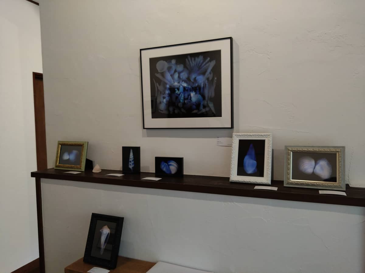 西村さん作品は貝殻7点(内アクリルブロックやフォトスタンドなど小物が6点)、ソフィアシリーズ7点、計14点が飾られています。ソフィアシリーズは、森山大道写真集「光と影」に印画紙とネガを挟み込んで光を当てたフォトグラム作品です。