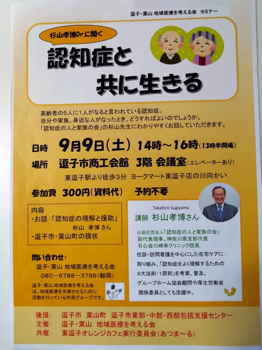 当日は杉山先生のお話のほか質疑応答、また鯨岡さんから逗子市・葉山町の現状、相談先、医療機関など お話いただきます。