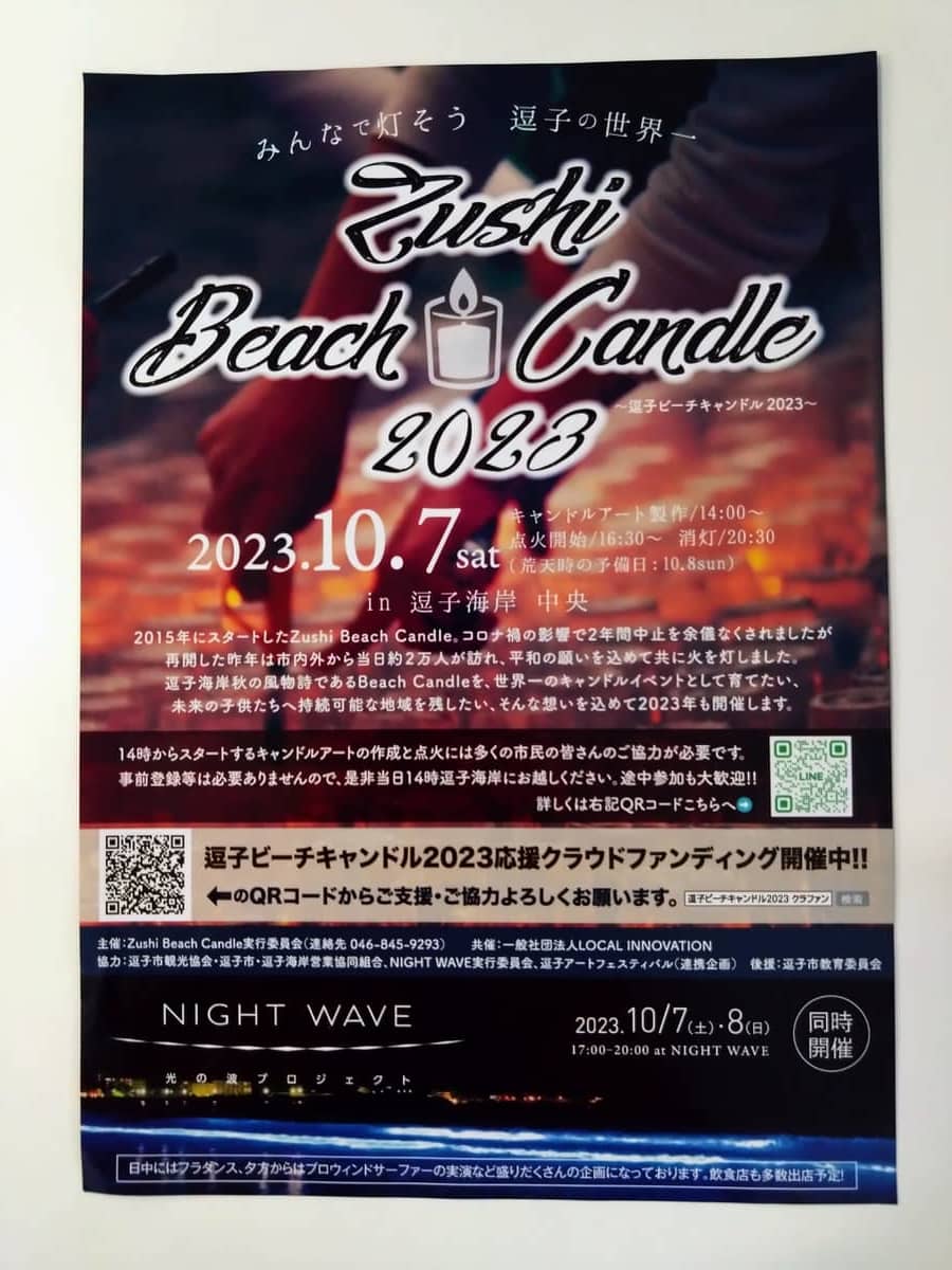 詳細はチラシ、QRコード facebook「Zushi Beach Candle」 、HPで逗子ビーチキャンドル2023クラファンで検索