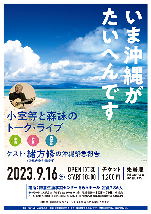 沖縄の平和や自衛隊の駐屯地の現状について考える催しが9月16日 (土)鎌倉生涯学習センターきららホールで開催されます。 「いま沖縄がたいへんです」と題して小室等さんと森詠さんのトークライブも行われます。