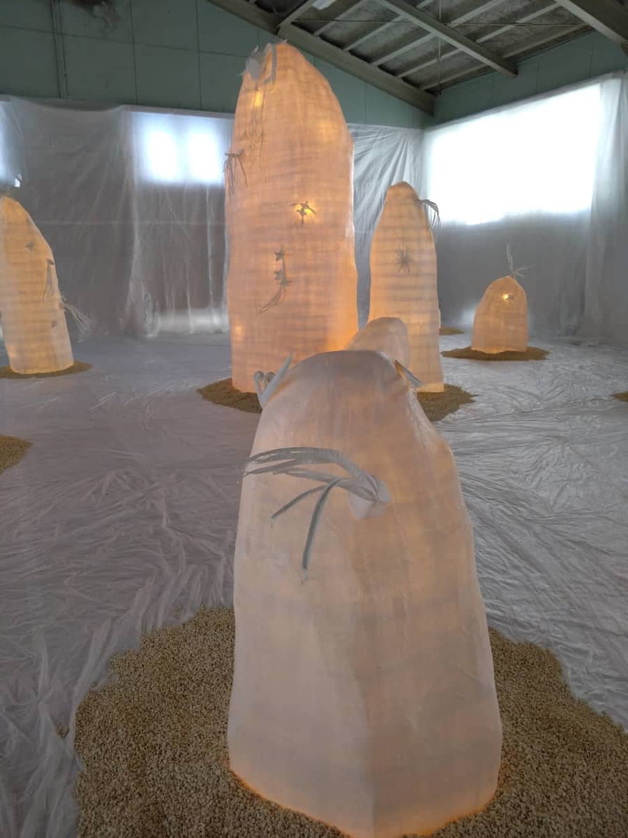 武道場では「余白の自然」参加型インスタレーションということで、パルプ紙でできた複数種の植物から 私は3つ選んであかりの灯った岩につけてきました。