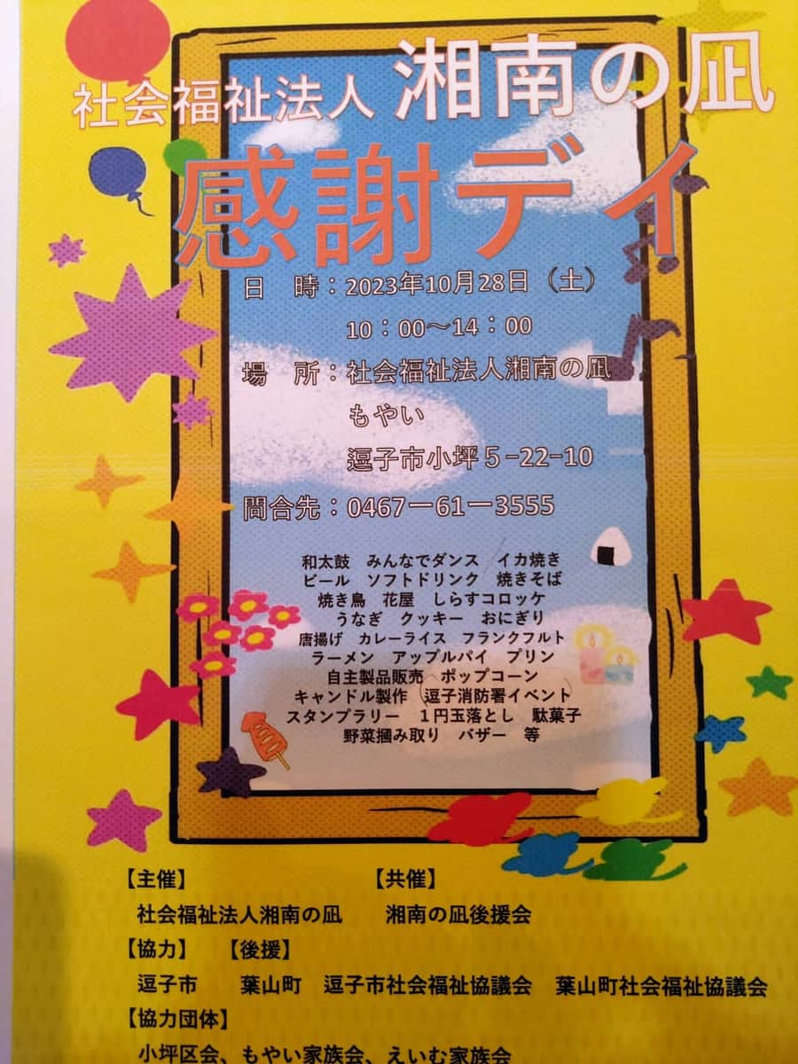 10月28日(土)10時~14時15分 社会福祉法人 湘南の凪もやい(逗子市小坪5-22-10) 逗子市役所前からシャトルバスが 出ます。市役所出発は9時半~13時まで 30分ごとです。