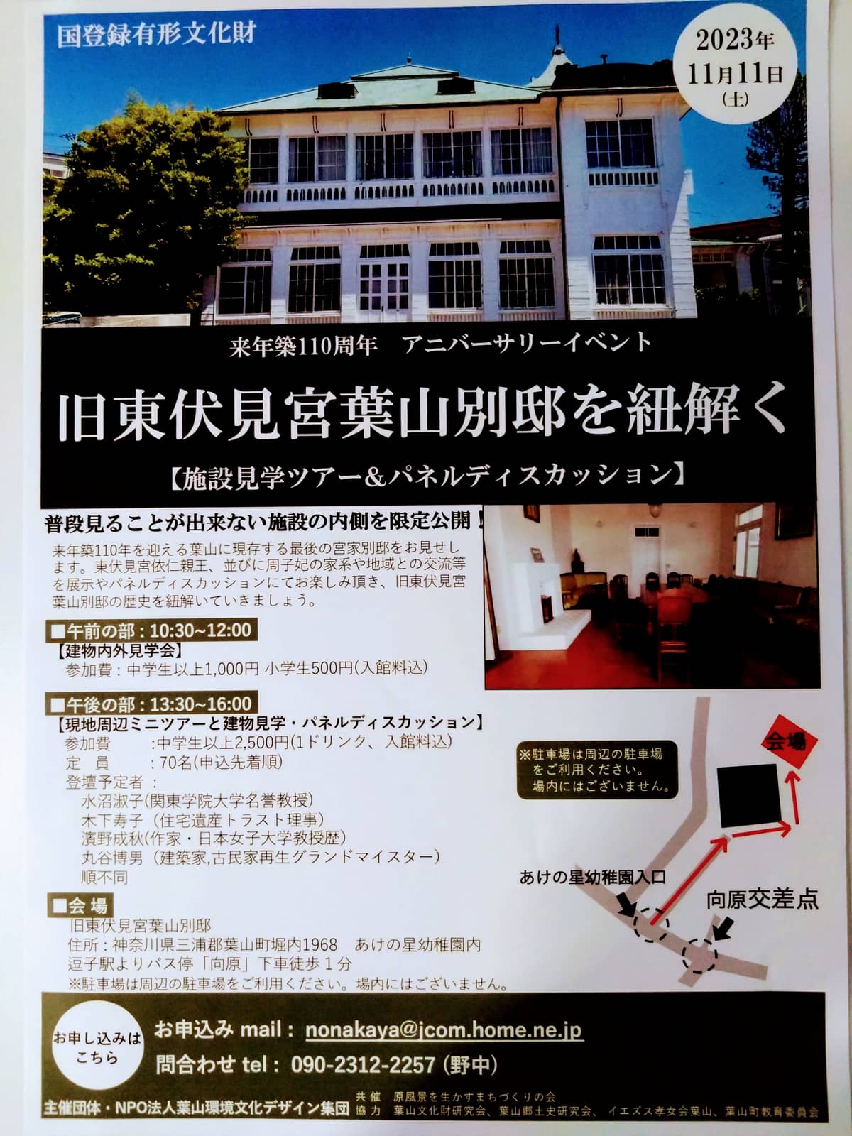 さて今回の「国登録有形文化財 旧東伏見宮葉山別邸を紐解く 来年築110周年 アニバーサリーイベント」では 普段見ることが出来ない施設の内側を限定公開! 来年築110年を迎える葉山に現存する最後の宮家別邸をお見せし ます。東伏見宮依仁親王、並びに周子妃の家系や地域との交流等 を展示やパネルディスカッションにてお楽しみ頂き、旧東伏見宮 葉山別邸の歴史を紐解いていきましょう~という企画です。