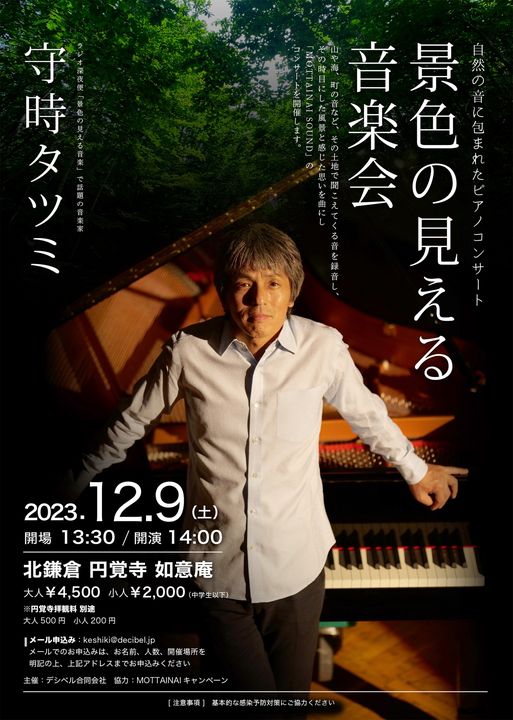 自然の音に包まれたピアノコンサート「景色の見える音楽会」が 北鎌倉円覚寺如意庵にて 12月9日(土)開催されます。 ラジオ深夜便「景色の見える音楽」で話題の音楽家・守時タツミさんをゲストにお迎えしました。