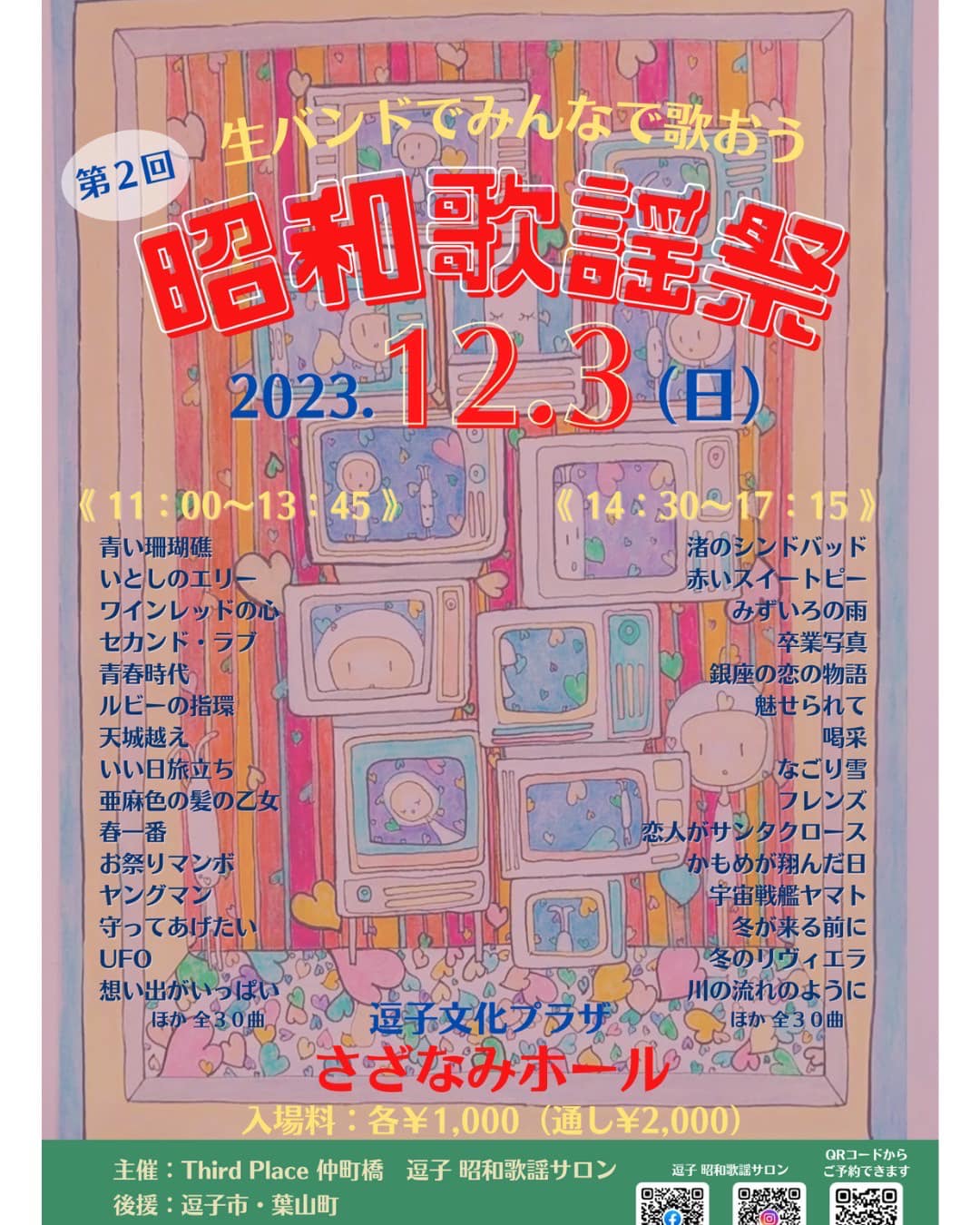 そして12月3日開催の「第二回昭和歌謡祭」のチラシの絵を描いていらっしゃいます。各所に置かれていて、逗子葉山の掲示板にも貼ってありますね。