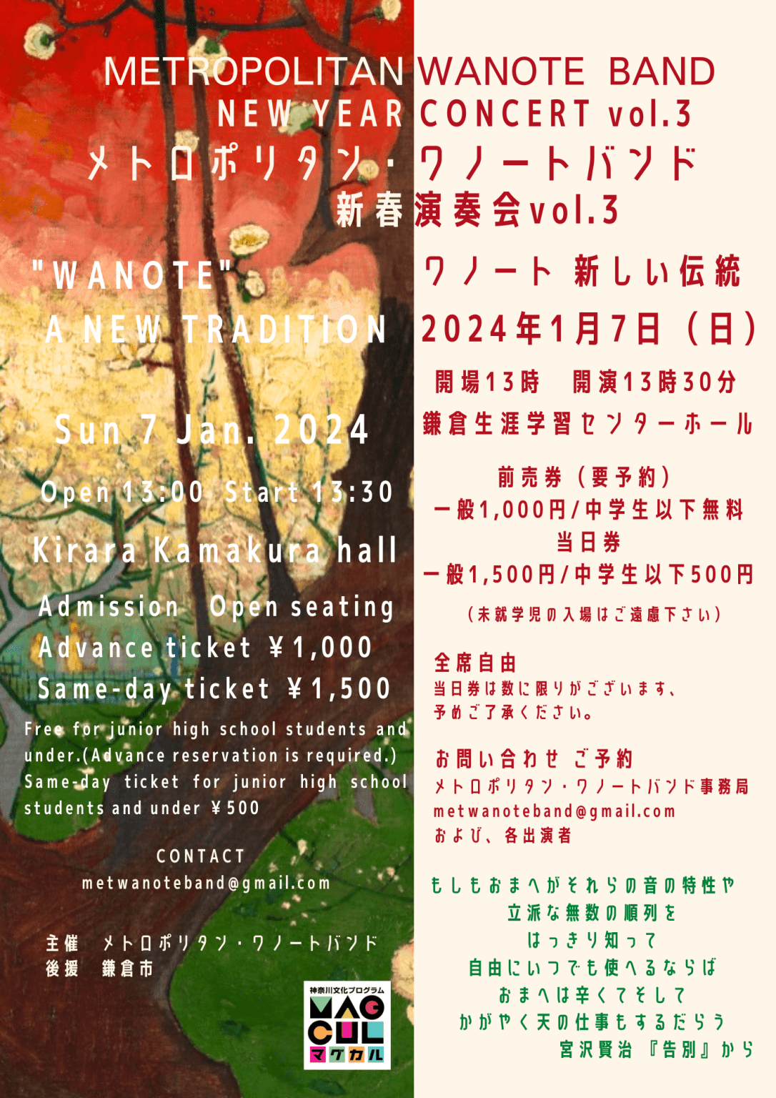 メトロポリタン・ワノートバンド 新春演奏会 vol,3 1月7日(日) 鎌倉生涯学習センターホールで開催! 今日のゲストは メトロポリタン・ワノートバンドディレクターで作曲家・三味線演奏家の宮内基弥さん、長唄三味線演奏家の守啓伊子さんです。