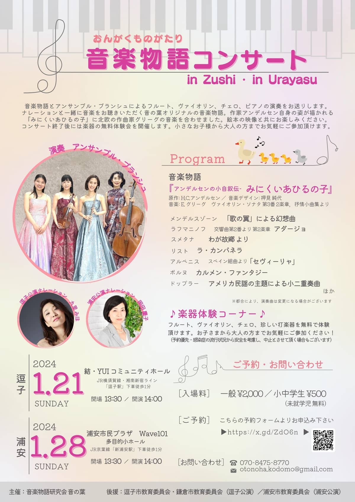 「音楽物語コンサートin Zushi 」が1月21日(日)結・yui コミュニティホールで開催。 音楽物語研究会 音の葉 代表でヴァイオリニスト の押見純代さんと ピアニストの宇田川日和さんをスタジオにお迎えしました。