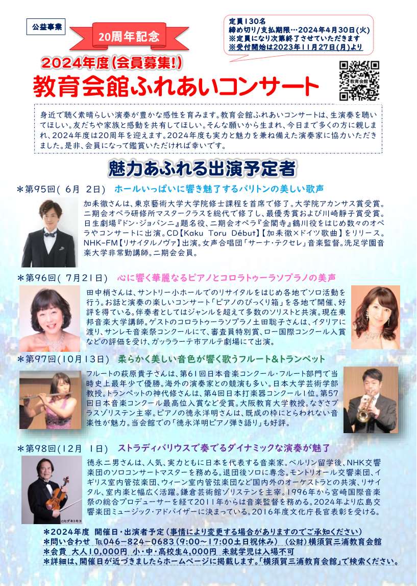 横須賀三浦教育会館(横須賀市日の出町)は、逗子市・葉山町・横須賀市・三浦市に勤務する教職員の積立基金と逗子市・葉山町・横須賀市・三浦市の自治体の支援により建設され 今年60周年です。設立の目的は、三浦半島における教育文化の発展に寄与することです。 この目的を達成するため、教育会館として、市民参加による公益事業の充実を図っています。特に、「教育会館ふれあいコンサート」は、市民に親しまれ、2024年度は20周年を迎えます。