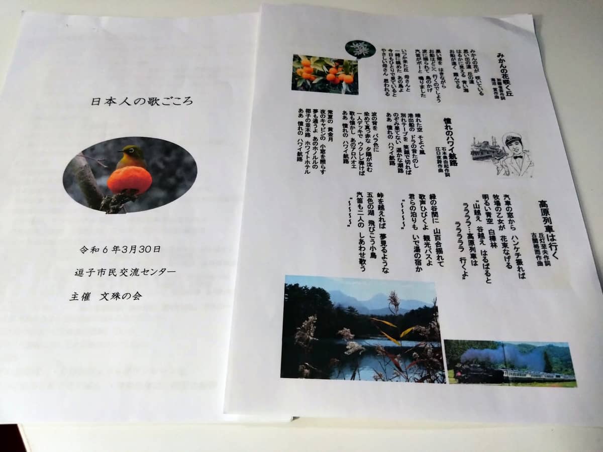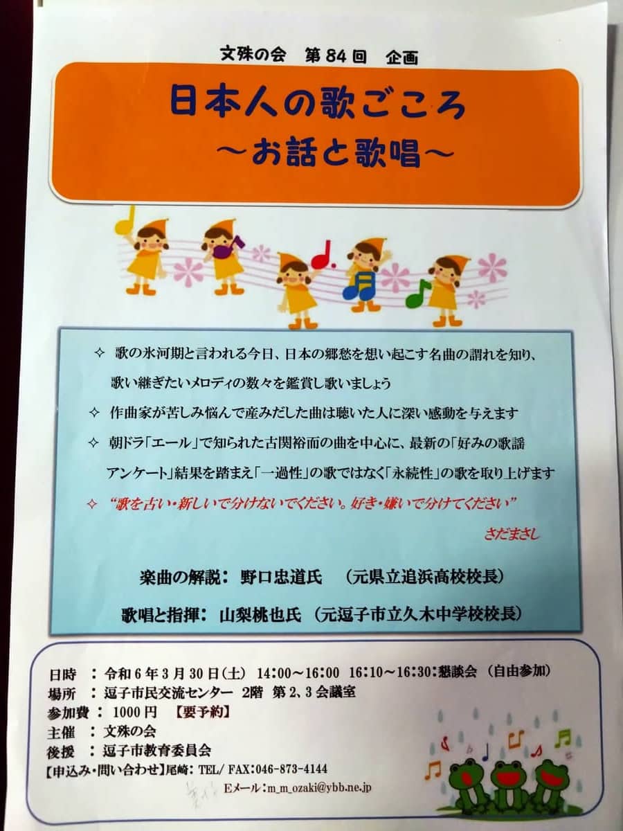 文殊の会第84回企画 「日本人の歌ごころ~お話と歌唱~」が 30日(土)逗子市民交流センターで開催されます。文殊の会代表 尾崎美代子さん、元県立追浜高校校長 野口忠道さん、元逗子市立久木中学校校長の山梨桃也さんをゲストにお迎えしました。