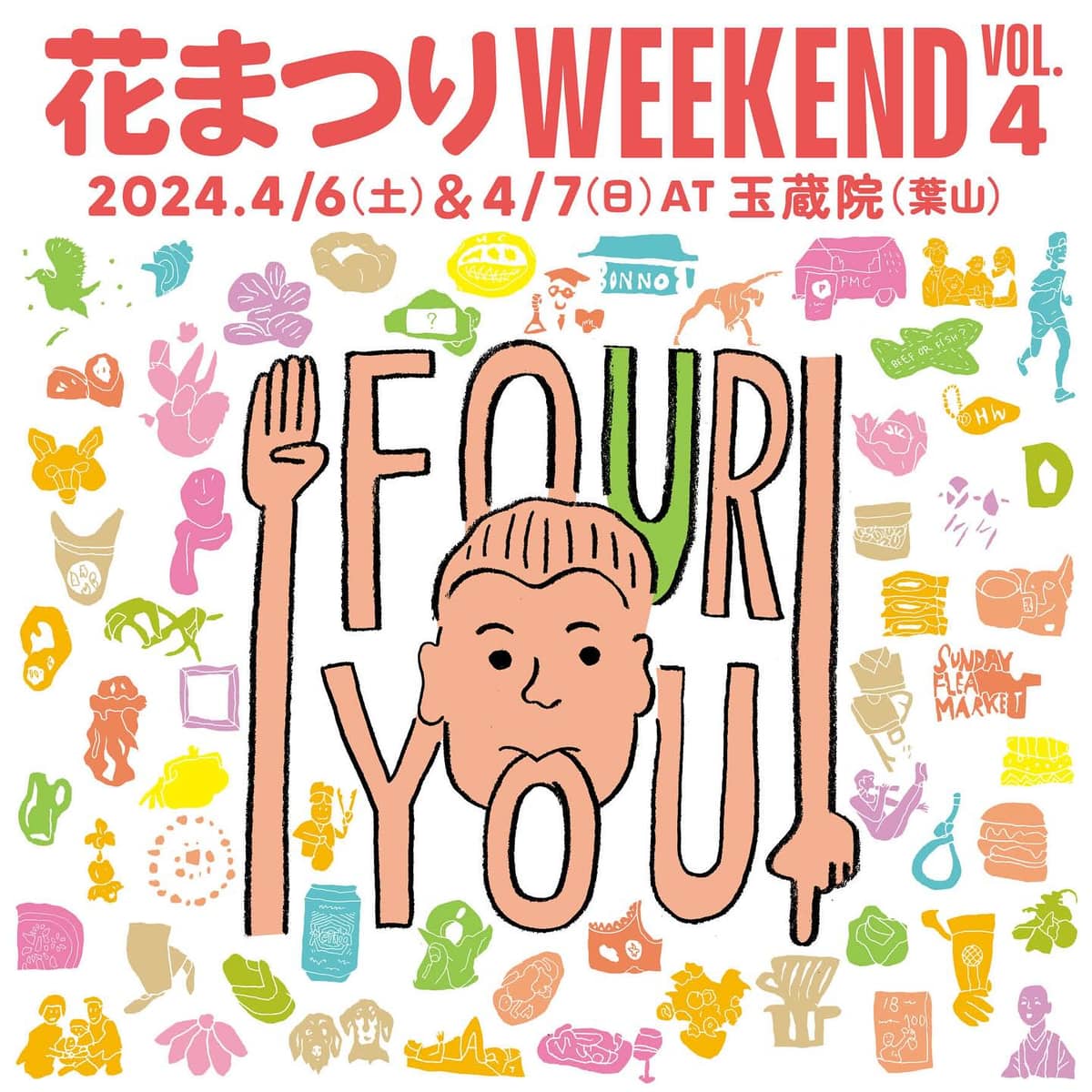 花まつりWEEKENDではテーマを設けて開催しており 今年は4回目をかけて「FOUR YOU」。誰かを想うあなたのために、お客さん、出店者、開催 している人たち、みんなが誰かを大切に想う。ここに来る人みんなが、そんな温かな気持ちにな れる2日間を目指します。