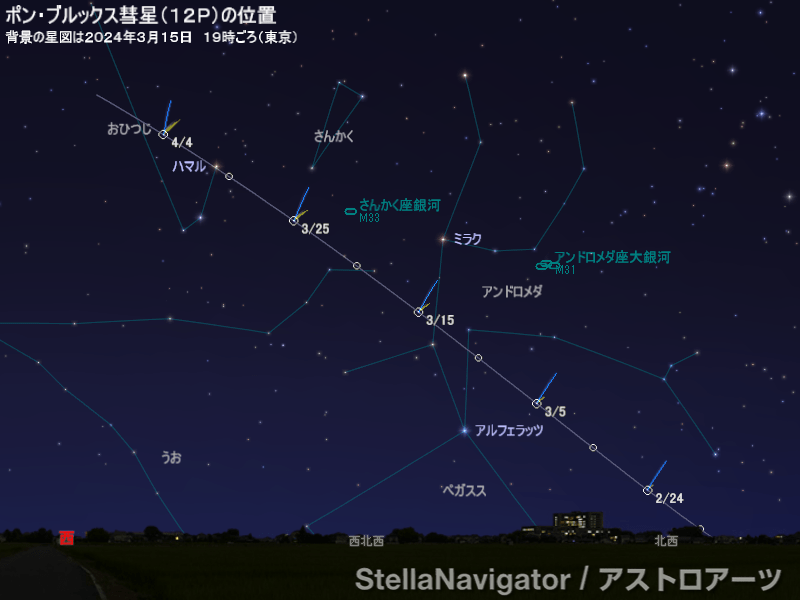 3月はアンドロメダ座からうお座、おひつじ座へと移動していき、夕方から宵の早い時間帯に西北西の低空に見える。明るさは5~6等級と予測され、肉眼で見るのは厳しそうですが、双眼鏡での観察ならナントカ見えるかも。4月はいるとさらに太陽と地球に近づくので、今よりも明るくなると予測されています。4月4日で日没後1時間くらいの西北西の空高度10度くらいなので結構低いですね。どの辺りを双眼鏡で似れば良いのか?これh説明が難しいので、ぜひ、興味のある方は、いろいろと検索してみてください!