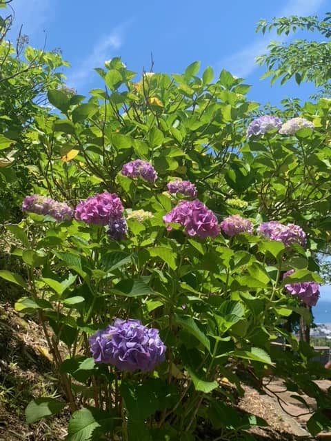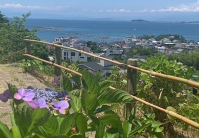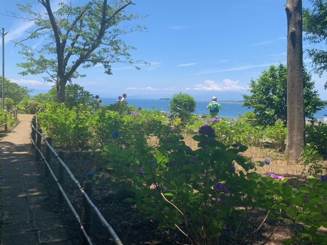 紫陽花と海の景色…お天気が良ければ富士山をバックに江の島、森戸神社、裕次郎灯台も見えます。相模湾を見下ろす景色は紫陽花の季節ではなくても行く価値はあると思います。