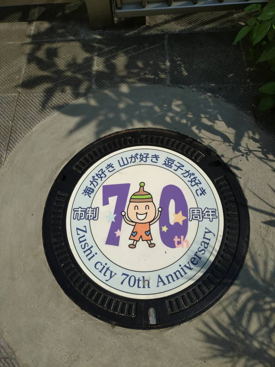 キャッチフレーズの「海が好き、山が好き、逗⼦が好き」 と広報キャラクターのシズオが載った70周年記念ロゴマ ークをマンホールにしています。