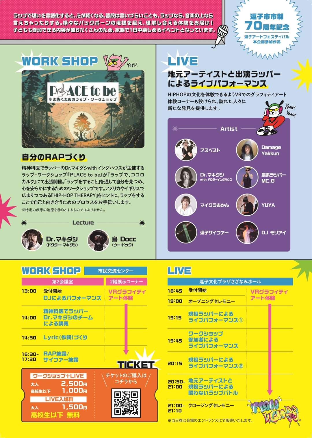 ワークショップとライブという構成で、ワークショップでは、実際にラップを作り、最後には、作った歌詞を舞台で、披露することもできます。 ・子どもも参加できるイベントになっているので、ご家族やお友達と一緒に参加してみてください!と市長。お問合せは 実行委員会09042815763 下崎さんへ 当日券は会場のエントランスで販売