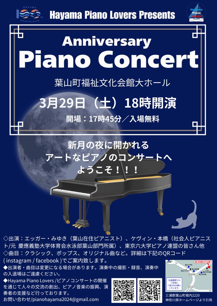 3月9日(土)花の木公演で「まちぐるみfesta2025」 、3月29日(土)と30日(日)「第23回まちfes 葉山」が福祉文化会館で開催、テーマは 「葉山の宝探し 100年先にも残したい葉山の宝を見つけよう!」二日間さまざまな企画の中、29日(土)18時~夜のピアノコンサートでは 葉山在住のピアニスト エッガーみゆきさん他の皆様がクラシック、ポップス、オリジナル曲を演奏します。