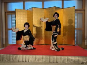 その後、会場を移してお食事をしながら、金屏風の前で、新橋芸者さんの舞を見て、お座敷芸を体験。