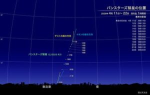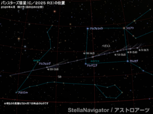 そんなパンスターズ彗星が2026年4月に見頃を迎えます。日本から比較的条件よく見えるのは4月中旬から22日頃までの明け方の空で、そのときの明るさはおよそ3等から4等になることが期待されます。でも位置が低空のため、なかなか難しいです。特に肉眼では。よく晴れた空が澄んだ日に暗い場所で見た場合には、肉眼でぼんやりとした彗星の姿を観察できるかも?また4等程の場合でも、双眼鏡を使うことで観察が可能になると予想されています。