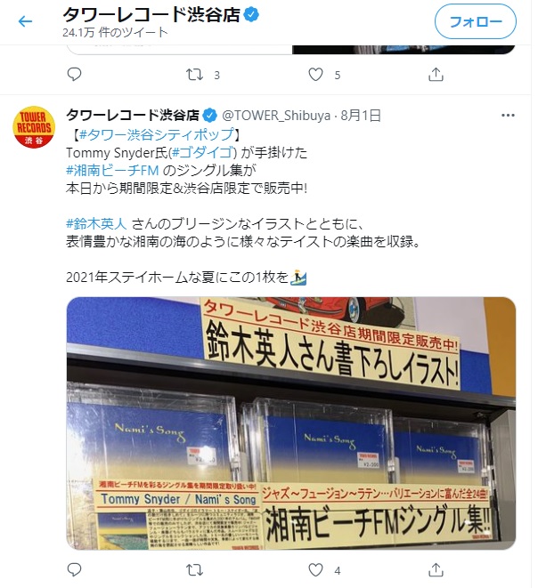タワーレコードでは『SUMMER BREEZE ’21キャンペーン』を記念してイラストレーター 鈴木英人氏のイラストを使用したコラボグッズを、販売中