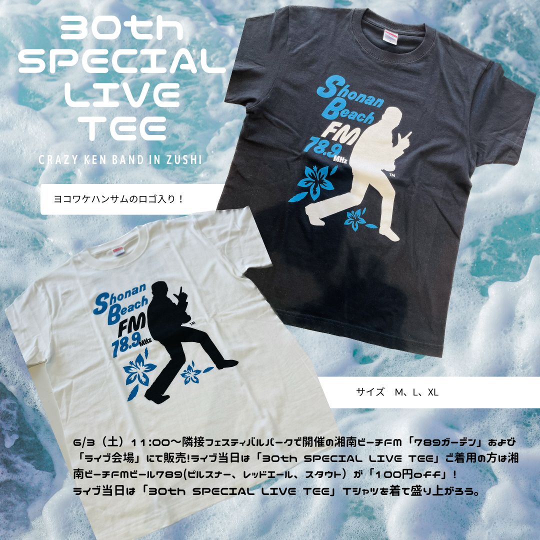 【特典】ライブ当日、隣接のフェスティバルパークで開催の「湘南ビーチFM789ガーデン」にて「30th SPECIAL LIVE TEE」ご着用の方は湘南ビーチFMビール789(ピルスナー、レッドエール、スタウト)が「100円off」になります。ライブ当日は「30th SPECIAL LIVE TEE」Tシャツを着て盛り上がろう。