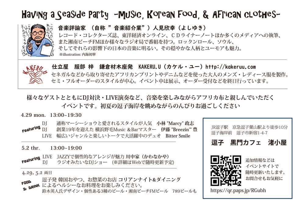逗子海岸前のカフェ 渚小屋にて開催の人見欣幸presnts “Having a Seaside Party wiyh Hit Me!and AZUSA”。